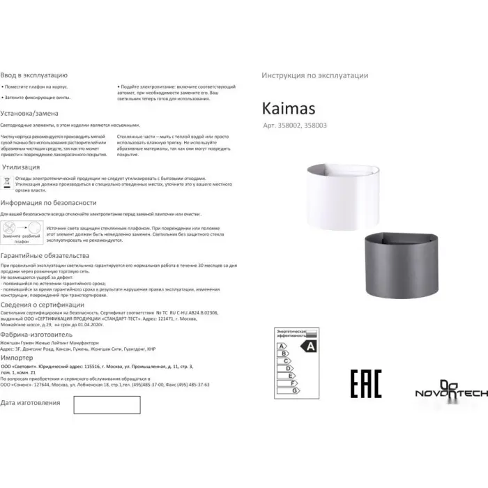 Главная Каталог Люстры и светильники Уличный настенный светильник Kaimas 358003